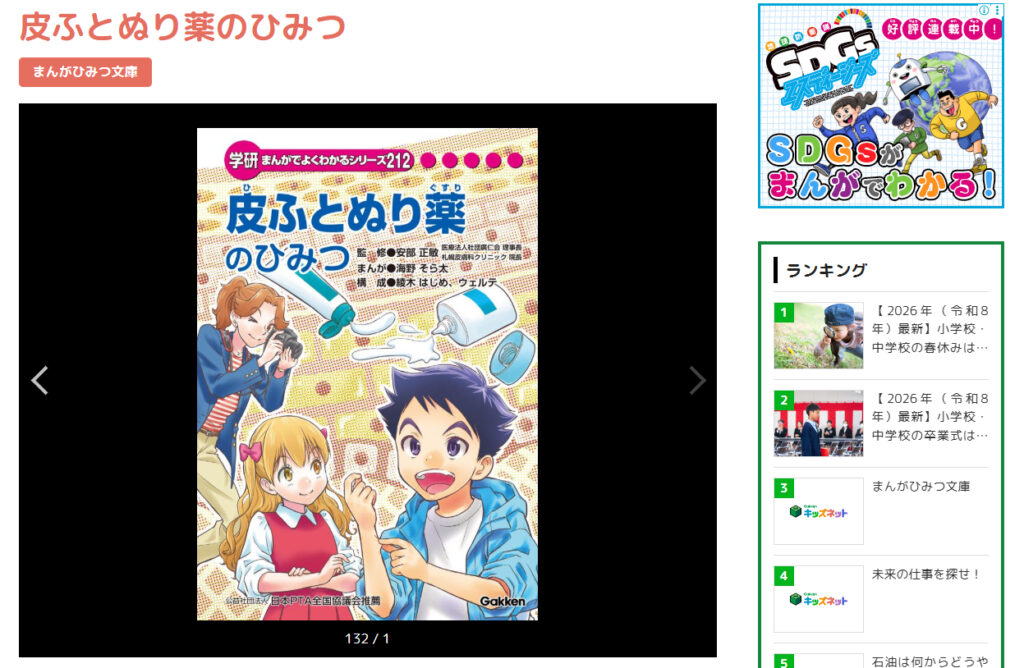 「皮ふとぬり薬のひみつ」は、子どもにもわかりやすく皮膚と薬について学べる内容で、皮膚の役割や構造、スキンケアの重要性、皮膚の病気、そしてぬり薬の仕組みまで幅広く解説されています。物語では、主人公たちがぬり薬を作る現場を見学しながら、皮膚の働きや正しいケア方法について学んでいきます。日常生活で役立つ知識や、薬がどのように研究・開発されているかも紹介されており、楽しみながら理解を深められる構成です。皮膚の健康を守るための基礎知識が身につく内容となっています。